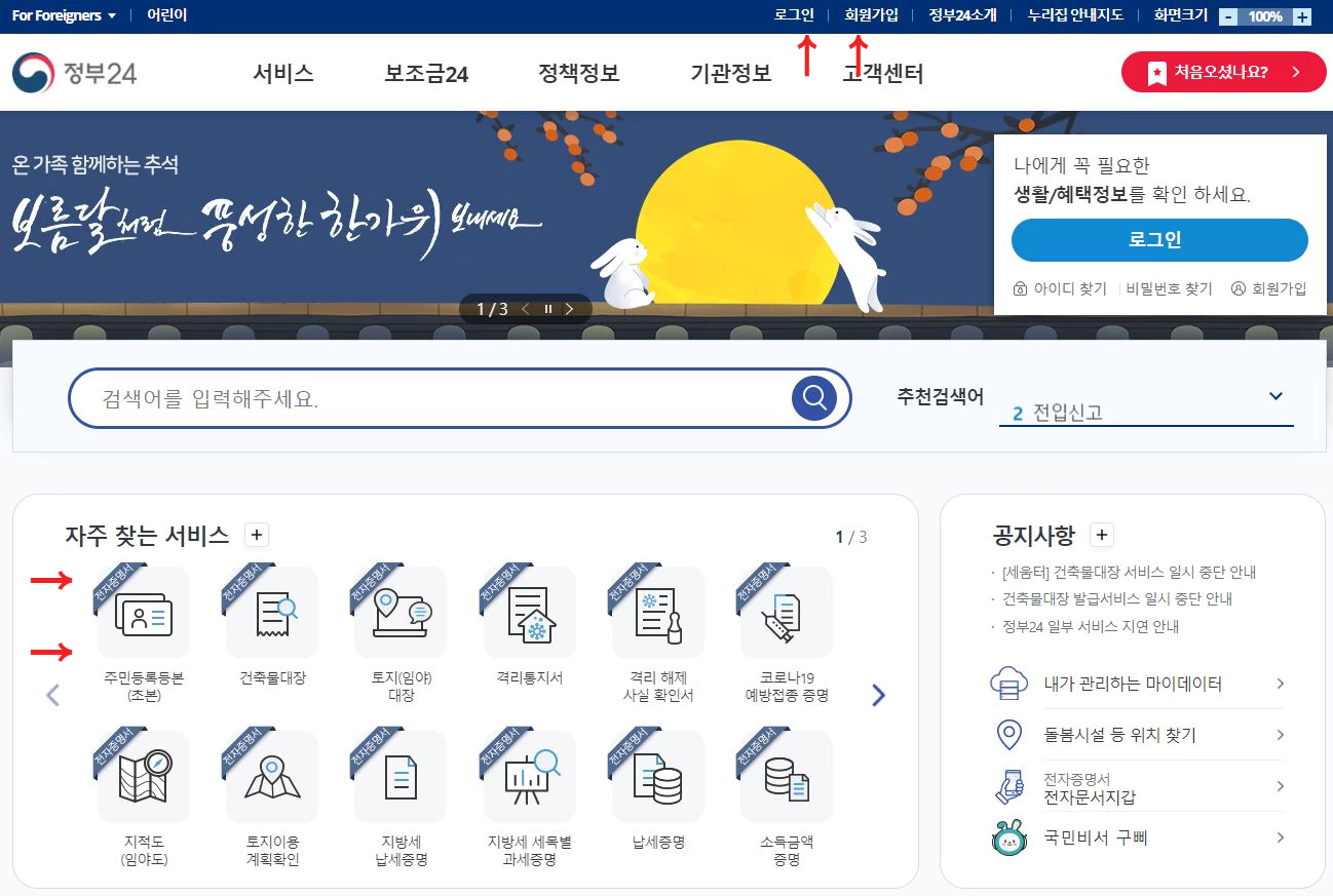 1. 정부24로 들어가 필요한 서류(주민등록 초본)을 발급 받습니다.