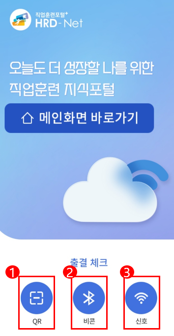 1번 - QR : 수업 시작할 때 사용하는 버튼입니다. 강사분께서 QR을 보여주면 저희는 그걸 찍으면 됩니다.