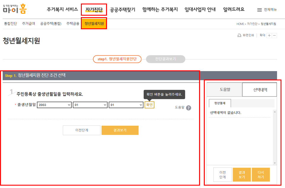 2. 상단 [자가진단] 메뉴 - [청년월세지원] 선택