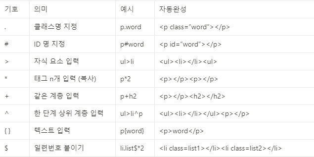 에밋(emmet)은 여러개의 코드를 기호로 연결지어 한 줄로 생성하게 해주는 기능을 말한다.