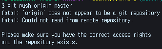 터미널에서 "git push origin master" 명령어를 사용하여 github에 있는 repositories 에 작업한 것을 등록하려고 했다.