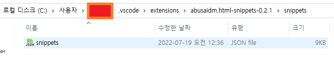 1. 로컬디스크(:C) > 사용자 > (사용자명) > .vscode > extensions > abusaidm.html-snippets-x.x.x > snippets 이동!