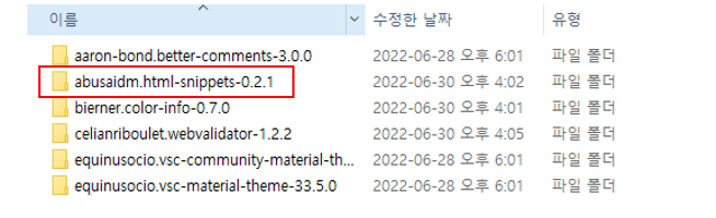 2. 로컬(C) - 사용자 - (사용자이름) - .vscode - extensions - abusaidm.html-snippets-x.x.x 폴더를 들어갑니다.