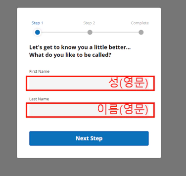 위에는 "성"을 아래는 "이름" 을 영문으로 치시고 다음스텝으로 GOGO